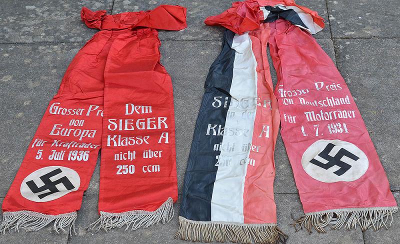 A pair of long red silk ribbons with bow to the top of each and with bullion fringe to the ends. Both ribbons display a large black swastika in white circle and then silver inscription for the victor of the 1934 and 1936 motor racing contests which I believe was for motorbike racing. These long silk ribbons were probably attach to a large floral wreath that would have been presented to the winner of each of the races. Most unusual, although I have had similar silk ribbons for Third Reich funerals this is the fist time I have had any for motor racing. These would look great displayed with an NSKK collection or a collection of motor racing memorabilia. Exc++