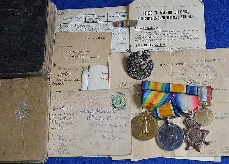 This set of 4 parade mounted medals comprises, 1914/15 star, General Service medal, Victory medal and a miniature medal for the 1937 coronation. Awarded to, 53496 DVR.W.H.ROBINSON R.E (Royal Engineers). Document comprise, military post card sent home to his family in Sunderland, various letter and document at the time of his retirement from the army in1919/20. Award certificates for his WW1 awards. Three certificates for Post War Credit. Two small pocket Bibles both of which bear his name and one being army issue. Royal Engineers cap badge and small ribbon bar belonging to Robinson. This large group was recently discovered in a house clearance. Exc++