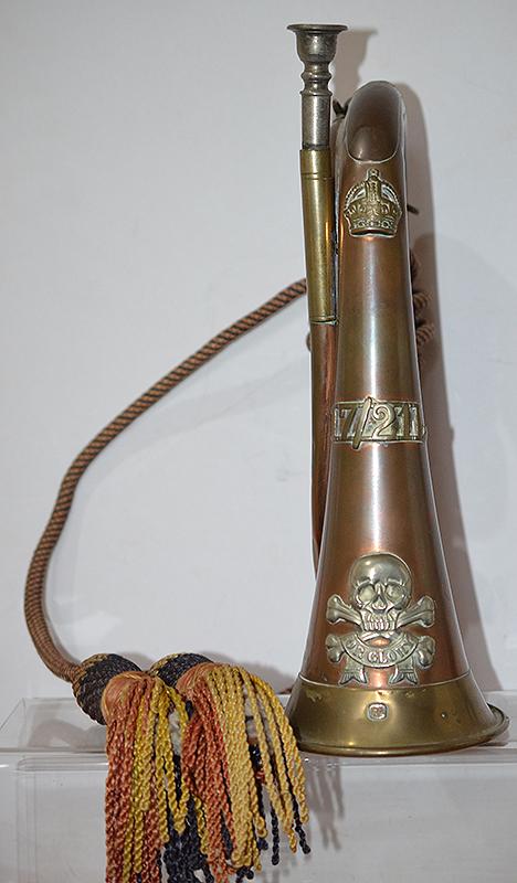 An interesting WW1 military bugle with lots off attached badges and issue stamps. I believe the bugle was originally issued to the the 17th lancers in 1917 but when the Regiment was amalgamated in 1922 and became the 17/21st Lancers the bugle was re-issued. Brass and copper bugle with attached Royal Kings crown, 17/21 unit numbers and the impressive death or glory silver Regimental skull badge. It is also stamped with British arrow issue mark and then CAMBRA 1917.18 and with a small brass plaque marked RL. There is also another much larger plaque marked, 7845.BUGLER R.LANRENCE, this is probably the original owners name and so it might be possible to research the original owner. Complete with cloth cords. This is probably the most impressive British military bugle I have owned. Exc++