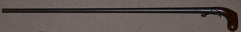 A most unusual item which looks like a walking stick but which is actually a rifle, these guns were popular at the time for self defence and also by poachers and dates to about 1840. Wooden curved handle with metal fitting for a detachable shoulder stock. Long steel barrel with metal trigger and hinged fitting for the percussion cap and with a very small sight to the end of the barrel, the barrel also has proof marks. Exc++