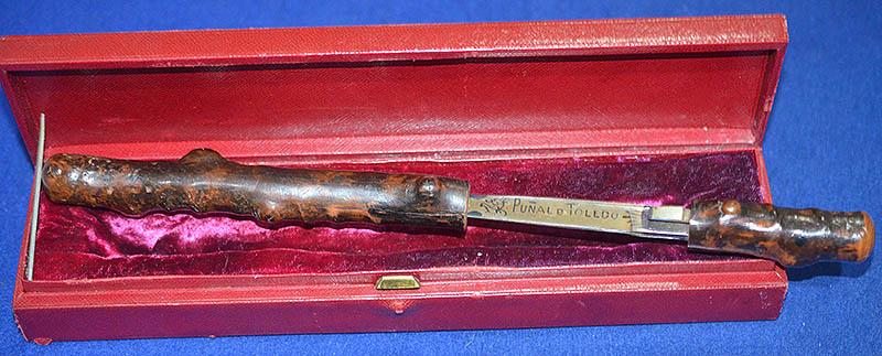 This superb quality novelty pocket size sword stick measures 9 inches or 22cm. Pressing a button on the wooden handle releases the handle and blade from the matching scabbard and reveals a lethal blued steel blade which is etched, Recuerdo Punato Toledo. The blade was made in Spain and then probably imported into the UK and mounted into the wooden fittings. Complete with red leatherette box. NEAR MINT.
