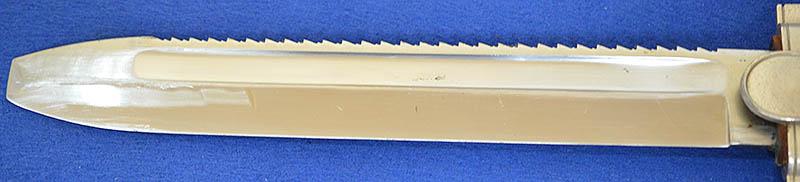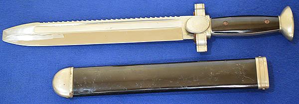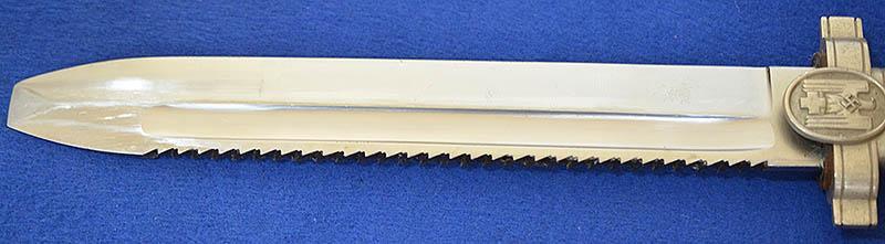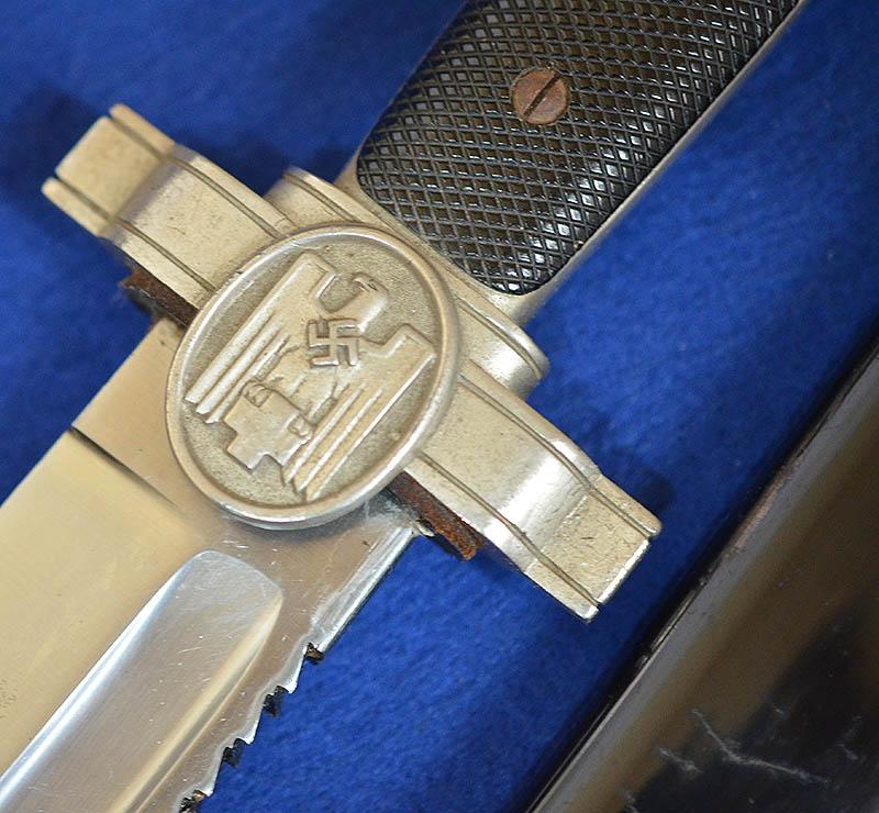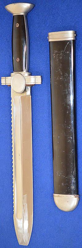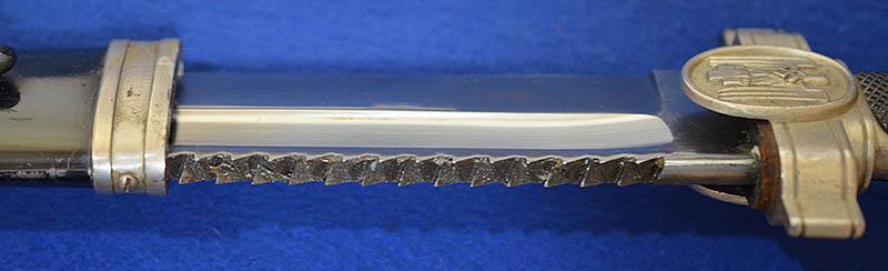 The hilt of the dagger still retains almost all silver plated finish with excellent detail to the crossguard Red Cross eagle and swastika insignia. The saw back blade is very impressive as it is still in mint condition, it is also stamped Ges Geschutze (patent pending) under the crossguard. No dents or damage to scabbard and it still retains approcamatly 98% original black paint, just showing light age wear as you would expect. This is a really a nice example, much better than most. Exc++ .