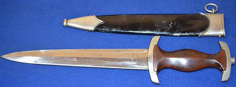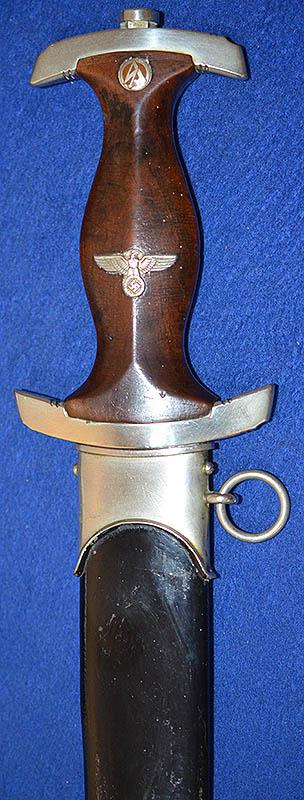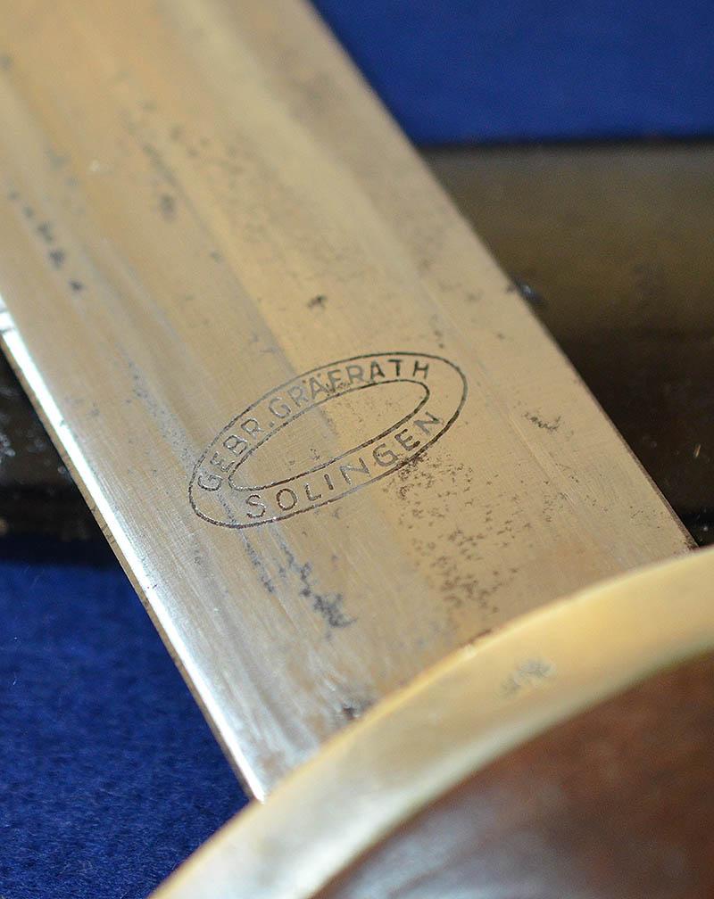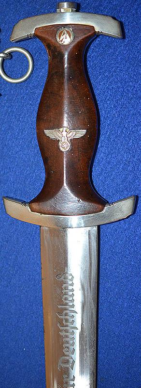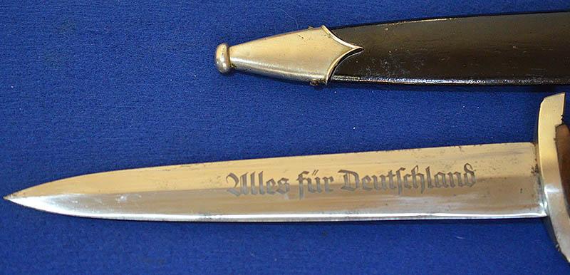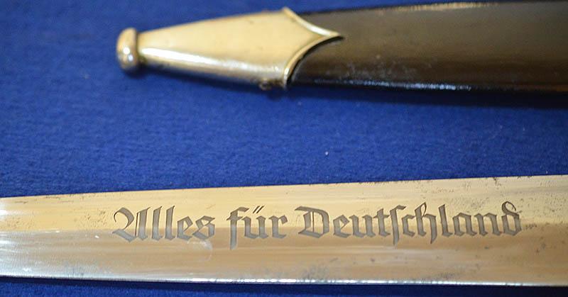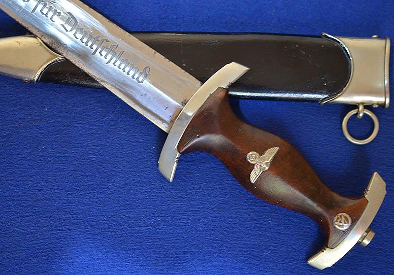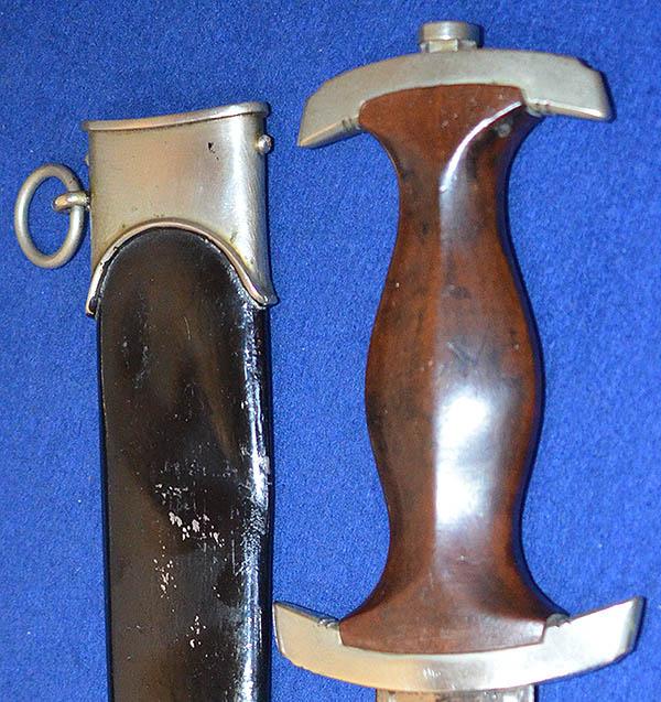 All early nickel silver hilt fittings are in perfect condition, the lower crossguard is stamped Nm for the Nordmark SA Groupe. Fine quality brown wooden grip is in perfect condition and it is inset with silver eagle and SA insignia, the quality of the wooden grip is especially impressive. The blade displays the SA motto on the obverse side and the reverse side features the makers details, Gebr Grafrath Solingen, the blade has a few small age marks but over all it is still very nice with much crossgrain remaining. Grafrath is a scarce maker to find and rating 7 out of 10 on the rarity scale, I do not recall having this maker before. Black painted scabbard is in excellent condition with just a shallow dent to the reverse side, the fittings are matching nickel silver. Originally the scabbard would have been brown but in 1936 the NSKK were ordered to re-paint there scabbards black to match the colour of there breeches, some members opted to return there scabbards to the factory for re-painting but many opted to re-paint the scabbard them self's and this is what this NSKK man decided to do. Exc++