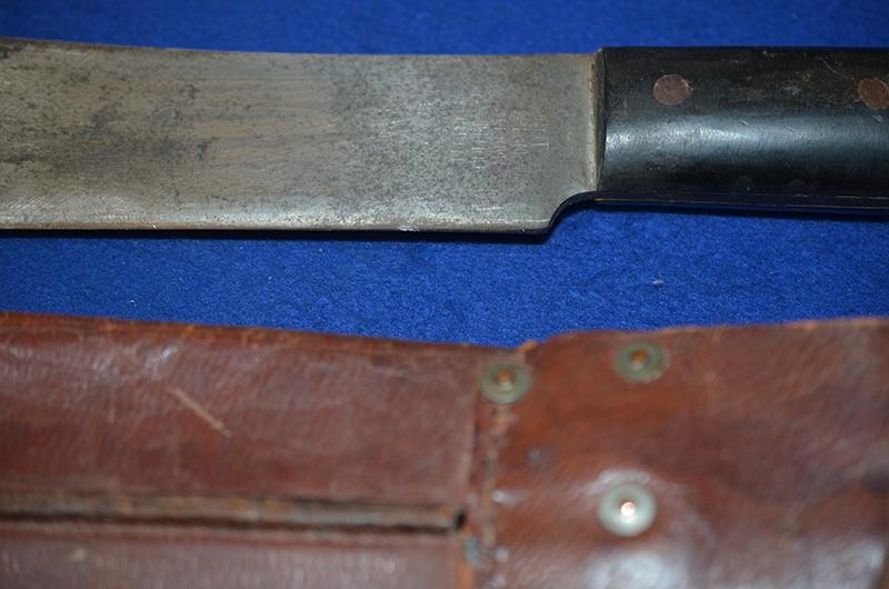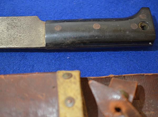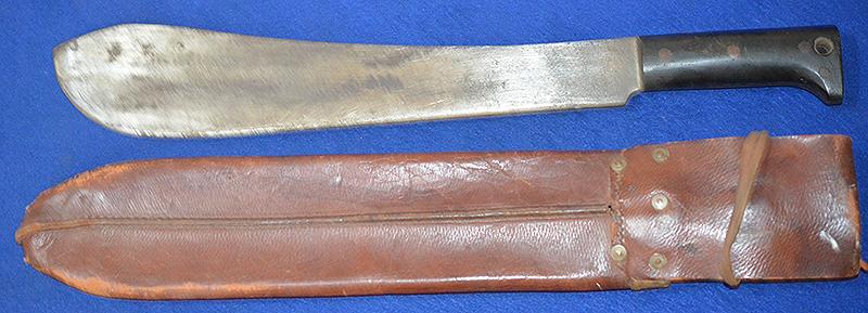 Large machete sidearm. Black grip plates held in place by metal rivets. Impressive bolo type blade shows age and it is maker marked, LEGITIMUS COLLINS& CO MADE IN USA NO1250 1941. Complete with matching brown leather scabbard with grip retaining strap. Exc+
