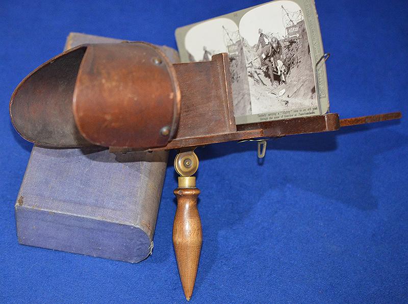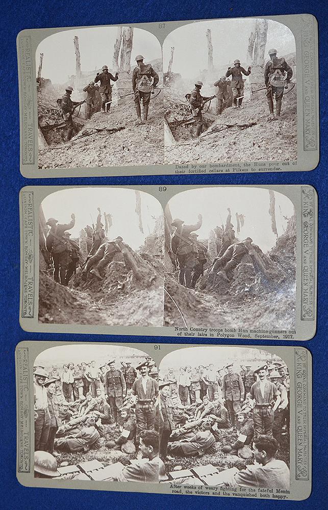This set contains 26 superb 3D WW1 photographic slides depicting British troops in the trenches on the Western front. The cards are contained in there original card holder that simulates a book with title to the spine. Complete with the original wooden 3D viewer. Fascinating set. Exc++