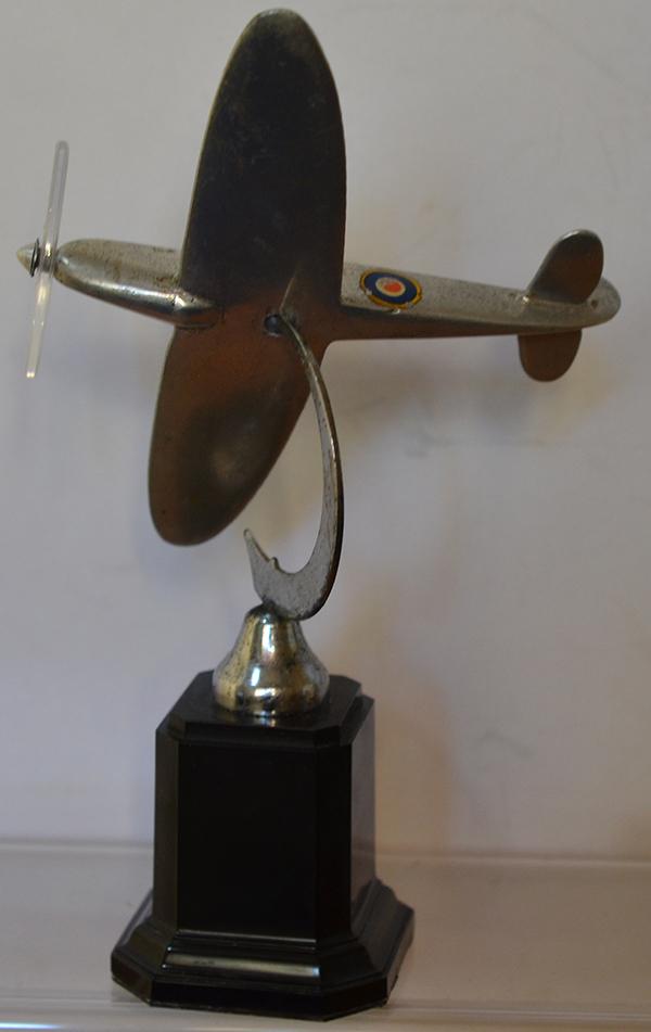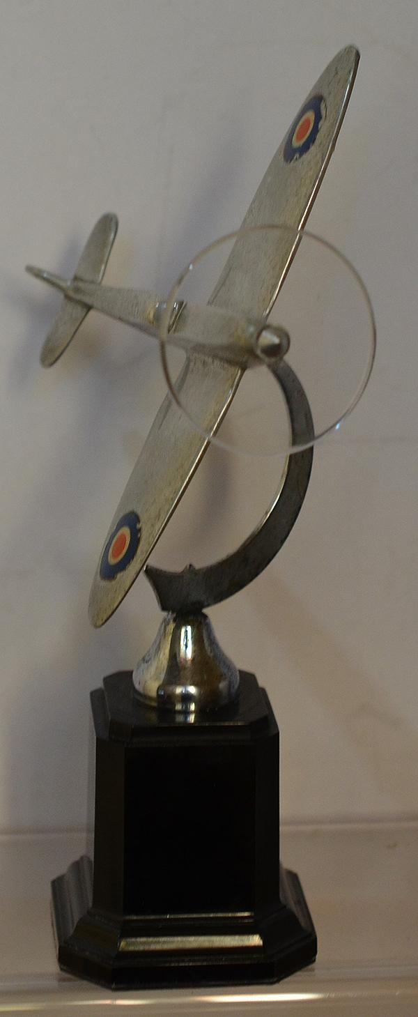 Superb aluminium model of a British RAF spitfire aeroplane which displays RAF roundels. The aeroplane is mounted on a chrome stand and which is then attached to a Bakelite plinth. Height with stand 9 inches or 23cm. Very attractive model which would look great on a collectors desk and far better quality than similar examples that I have seen in the past and which are often cast brass. Exc++