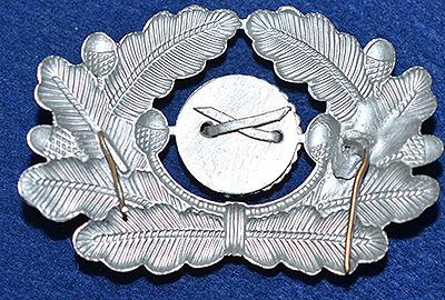 Silver aluminium cap cockade for a peak cap. The reverse side is fitted with two retaining pins. Mint.