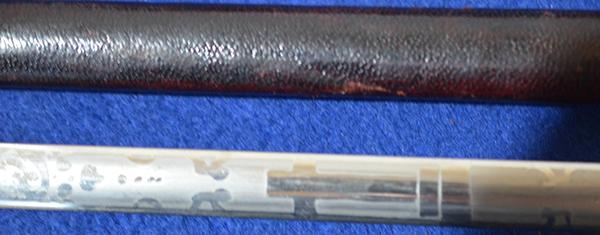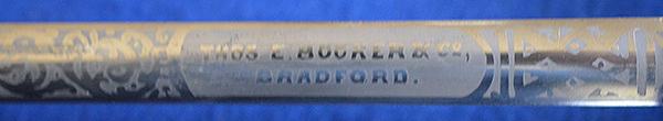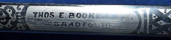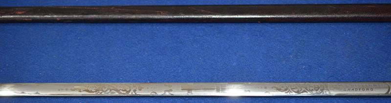 A nice example of a British masonic society dress sword dating to the early 1900's. Brass hilt with wire bound grip. The blade is in mint condition and it is double etched with a floral decoration incorporating the masonic cross design and it is maker marked, Thos.E.Booker & Co Bradford. Complete with leather scabbard with matching brass mounts. Exc++