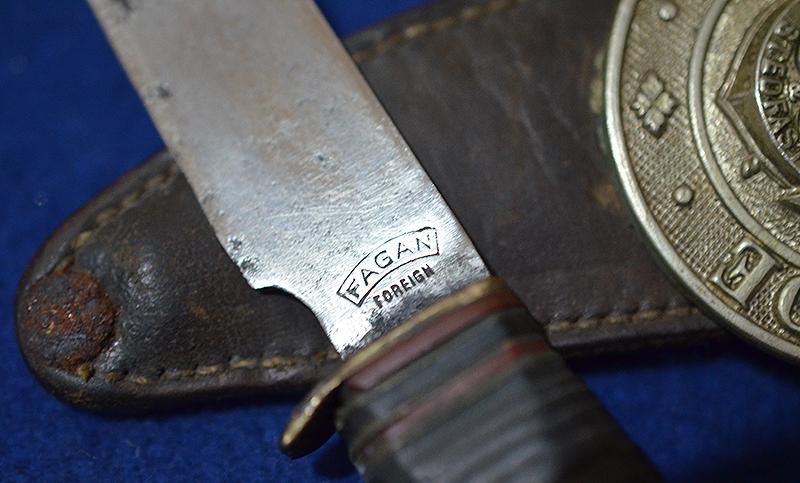Aluminium pommel. Leather bound grip and simple brass crossguard. The blade is in excellent condition just showing some minor age marks and it is maker marked, FAGAN FOREIGN. Brown leather scabbard mounted with large nickel silver badge marked, THE BOYS BRIGADE with large naval anchor, the scabbard is complete with belt strap and grip retaining loop, the popper button and part of the strap have come away but it is still attached. Exc+