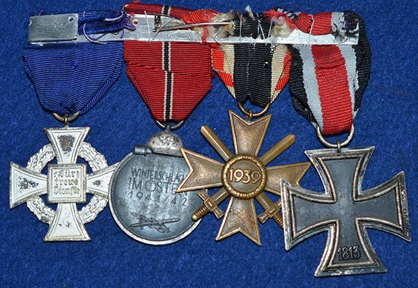 The set comprises, WW2 iron cross 2nd class, War service cross 2nd class with swords, Russian front medal and 25 year faithful service cross. The reverse side is fitted with small bar and hook for attachment to a tunic. Bargain price, they would sell for a lot more if sold separately. Exc++