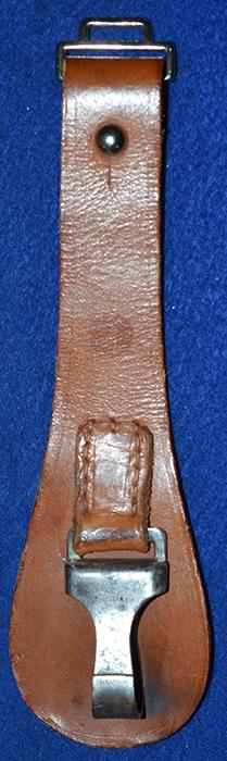 Brown leather hanger with metal spring clip which is in good working order. Field grey backing to the reverse side showing some wear from age. Exc++