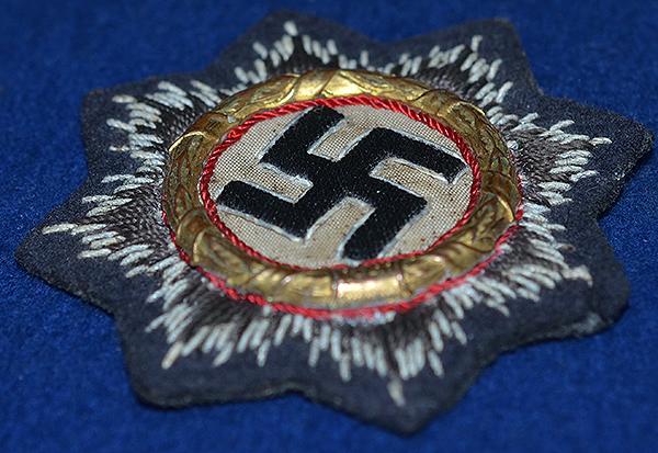Very nice cloth example of this high military award. The badge still retains almost all gilt finish to the metal wreath with excellent detail to the black woven swastika. Luftwaffe blue backing. The reverse side still retains much of its original paper backing. Removed from a tunic. Exc++
