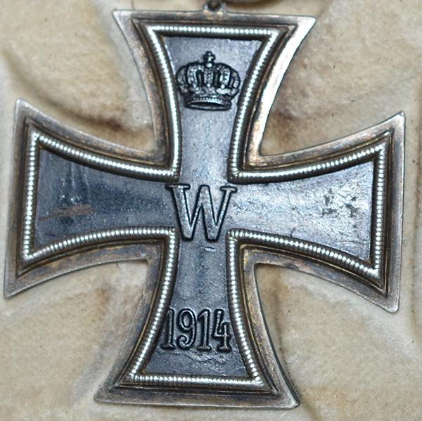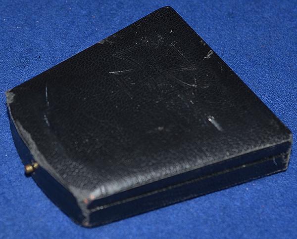 Very nice 2nd class iron cross with ribbon. Complete with scarce black leatherette presentation box of unusual shape, the exterior lid of the box is impressed with the design of the iron cross, the interior base of the box is fitted for the cross and the interior lid features the the iron cross design with patriotic motto below. Exc++