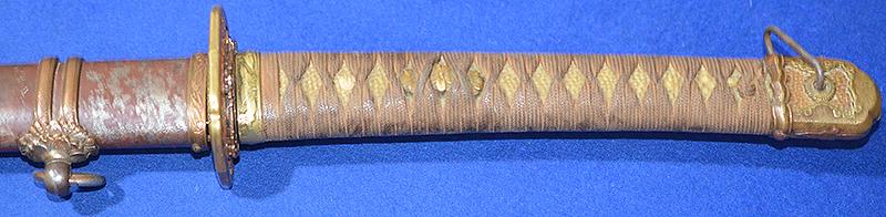 Cloth bound fish skin grip complete with three manuke to each side. Decorative pommel with swivel ring and ornate suba. War time blade with blood fuller shows some age spotting but it is still bright and looks nice. Metal officers scabbard still retains a good percentage of the original brown factory paint. Bargain price. Exc+