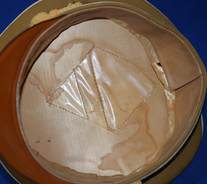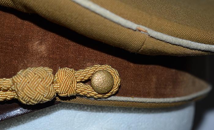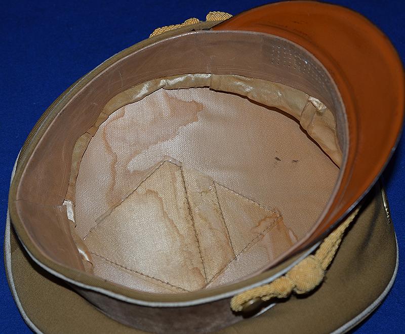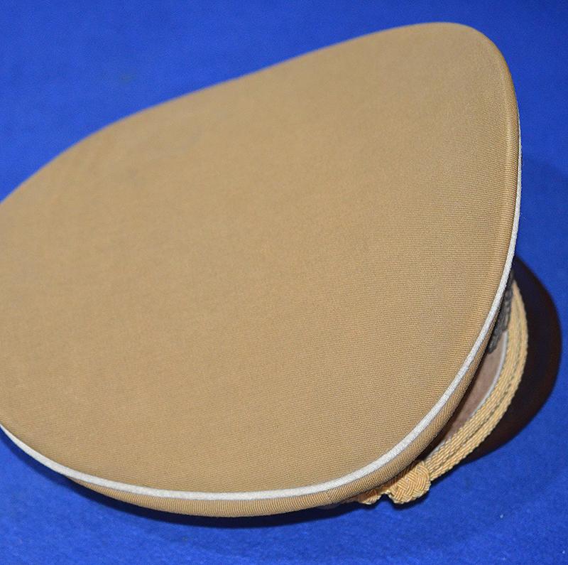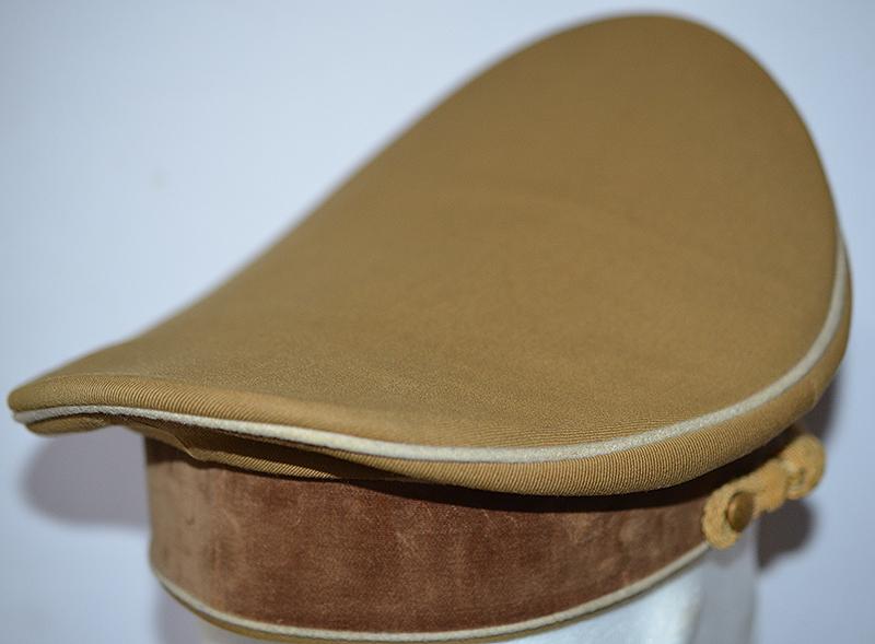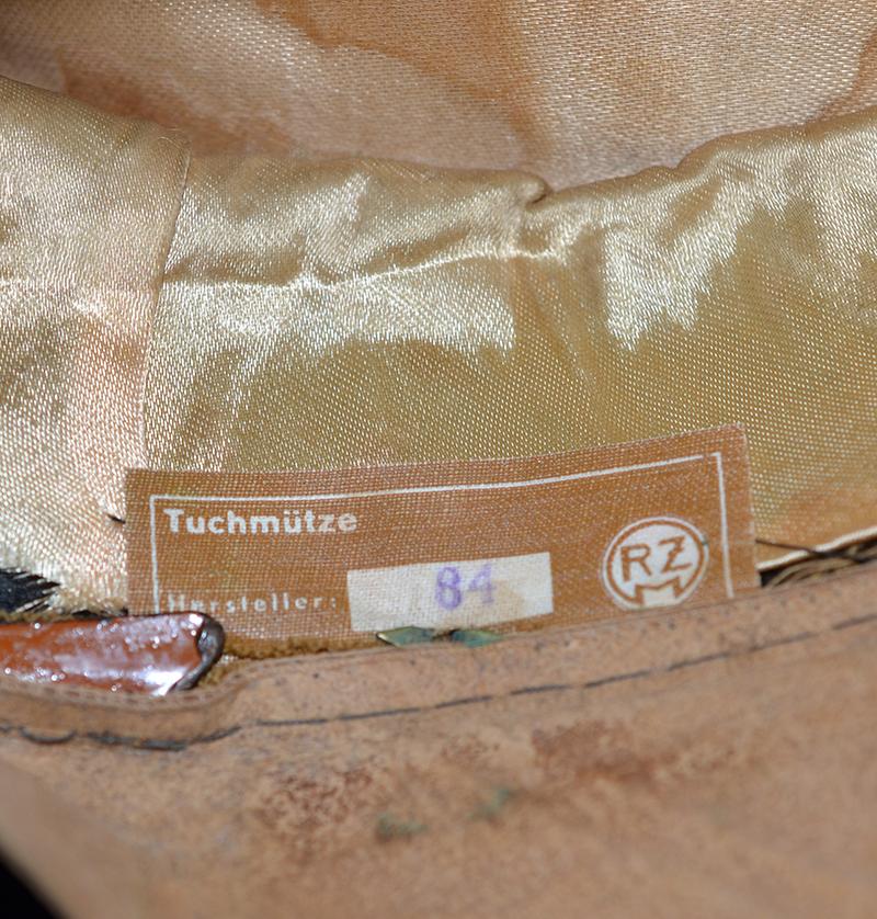 A nice looking cap with white piping as worn by the town / city Kreisleiter and his personal staff. Brown cotton top with dark brown velvet centre band with white piping. Complete with gold metal eagle and cockade with enamel swastika badge and a set of matching gold cap cords which are held in place by two gold side buttons. The interior of the cap features a gold silk lining with some sweat staining and it is fitted with a plain celluloid patch, the sweat band is in perfect condition and there is an RZM label to the underside. One tiny both nip to the white edge piping (see photographs) but other than that it is very nice NSDAP leaders hat. Exc++