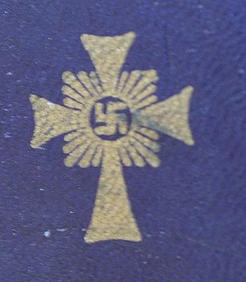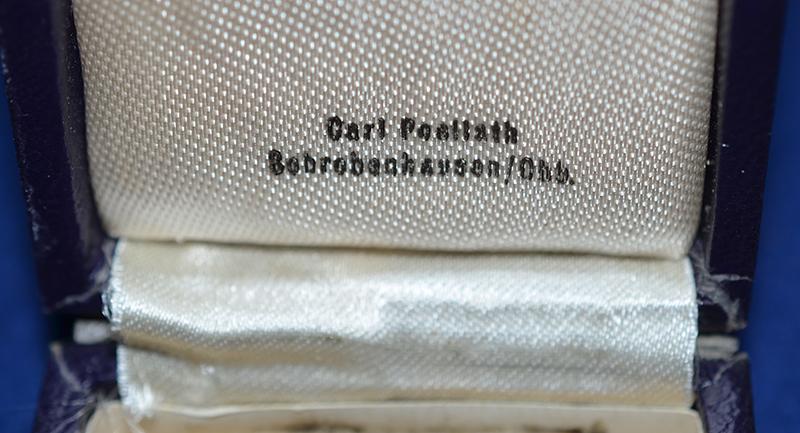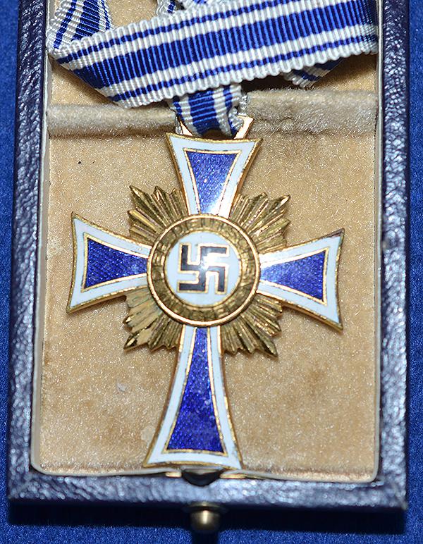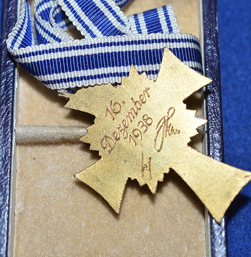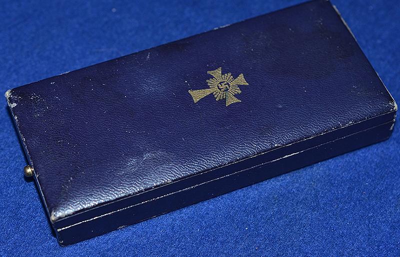 The medal still retains all gilt finish and the blue and white enamel is in mint condition. Adolf Hitler inscription to the reverse side. Attached to the medal is the original long neck ribbon. Complete with dark blue leatherette presentation box with award design to the lid. Mint.
