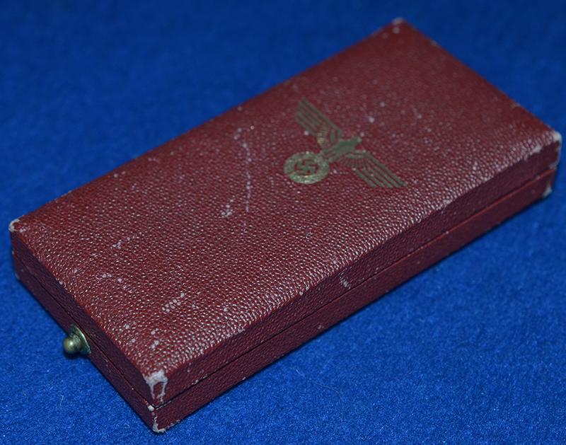 Fitted to the medal is the original ribbon. Complete with original dark red leatherette box with gold eagle to the lid. Mint