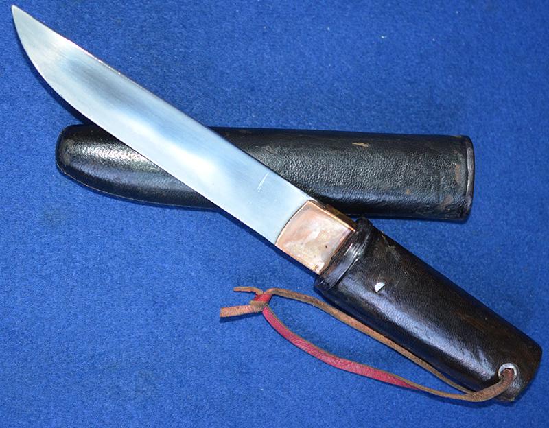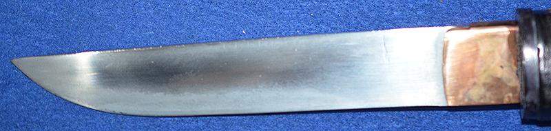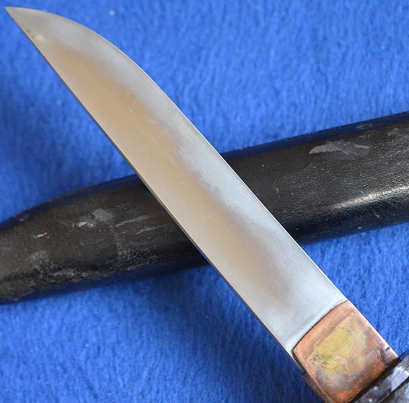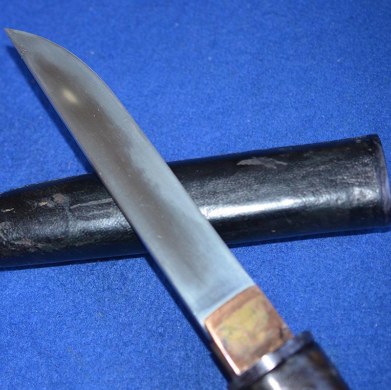 Small Japanese air force pilots Aikuchi dagger. Black leather grip is in excellent condition. The near mint blade measures 6 inches long including the brass Habaki and the blade has a well defined Hamon line. Matching leather covered scabbard. Total length almost 10 inches long. Near mint.