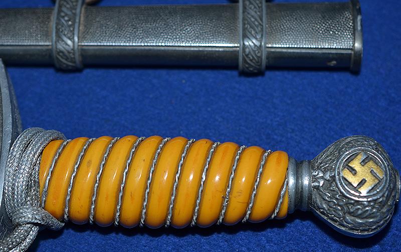 Mint orange grip. Fine detail to the eagle crossguard, the pommel still retains much gilt to the swastikas. The blade is still in very nice condition, it does have several age marks but these are very minor, the reverse side of the blade is stamped with the small Eickhorn Solingen trade mark and which is much harder to find than the larger etched type. The scabbard still retains moist of the factory finish. Complete with straps and silver knot. A very nice complete set and being by Eickhorn makes it very desirable. Exc++
