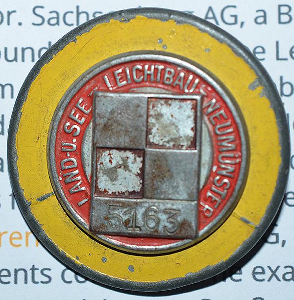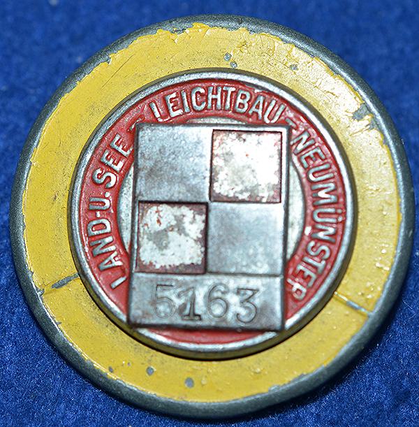 Circular metal badge with yellow border and red center and marked, LAND-U-SEE LEICHTBAU NEUMUNSTER with owners stamped identification number 5163.The reverse side is fitted with safety pin type fitting but the hook is slightly damaged now. The company was founded in 1936 by Sachsenberg AG, with plants in Keil and Neumunster. From 1939 the company operated as a Luftwaffe repair shop and also as an armaments production company. The company is known to have employed concentration camp prisoners and also forced labourers from various country's including Russia, France, Holland and almost certainly others and apparently the condition in the camps for the workers was very bad. Exc++