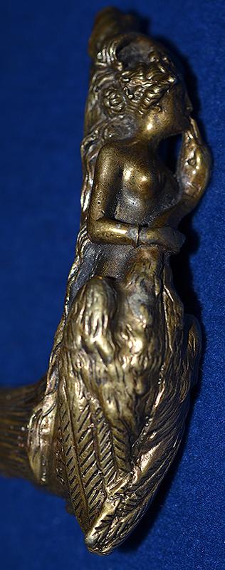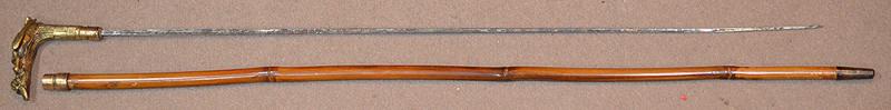The pommel on this stick is superb quality and it depicts an attractive young lady caressing a large swan. Bamboo stick with brass tip. Pulling the handle away from the stick reveals a long cruciform steel blade. Exc++