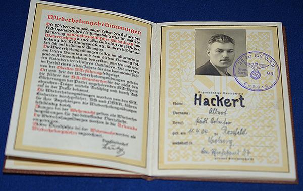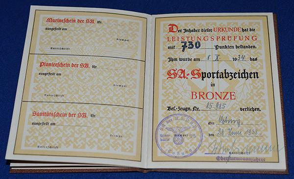 This is an interesting example as the original owner lived at Coburg, this town is historically important as it was the location of Adolf Hitlers first victory outside of Munich against the communists and Reds in 1922. Brown cover with gold title with Sports badge design to the cover. Inside of the book gives the owners details, Albert Hackert, born in 1904 and lived at Coburg with photo of the original owner with official SA issue stamp from SA Standarte 95 which was based at Coburg. The book shows that Hackert was awarded the SA sports badge in bronze on the 28.6.1938. Mint.