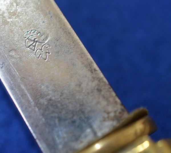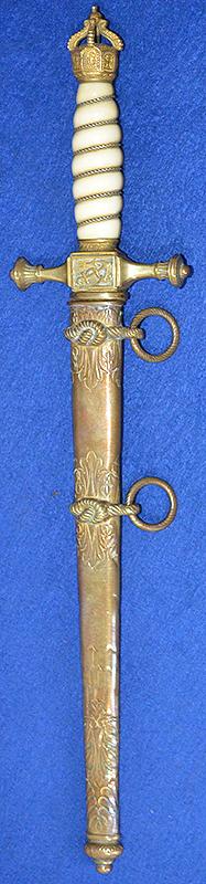 Superb quality open crown imperial pommel, the matching imperial crossguard is also very nice. The white bone grip is in fine condition with tiny scratch to the reverse side just under the pommel but no chips or crack, it is really nice grip. The double etched blade is by WKC and features there small knights head trade mark as used during the imperial period, the blade is double etched with long foliage panels and featuring the sailing ship and crowned anchor design, the blade is still in excellent condition, The matching brass scabbard is beautifully decorated with oakleaves to the upper section, the lower section features lightning bolts and then more oakleaves, the scabbard band are the rope type and the suspension rings are also engraved with a rope design, the reverse side of the scabbard is expertly engraved with the original owners initials. This is a really nice example of an imperial naval officers dagger which are very difficult to find especially when as nice as this one. Exc++