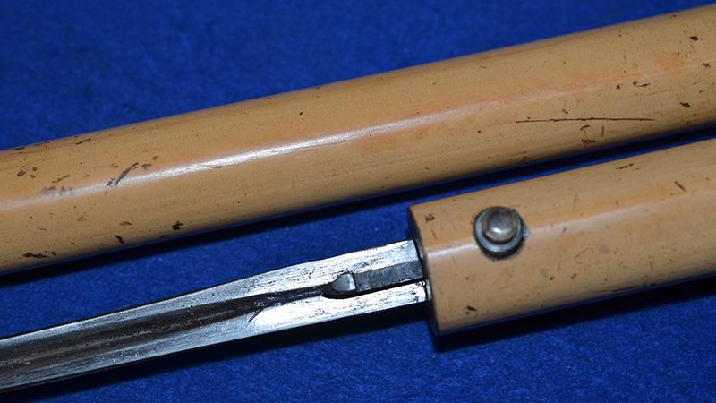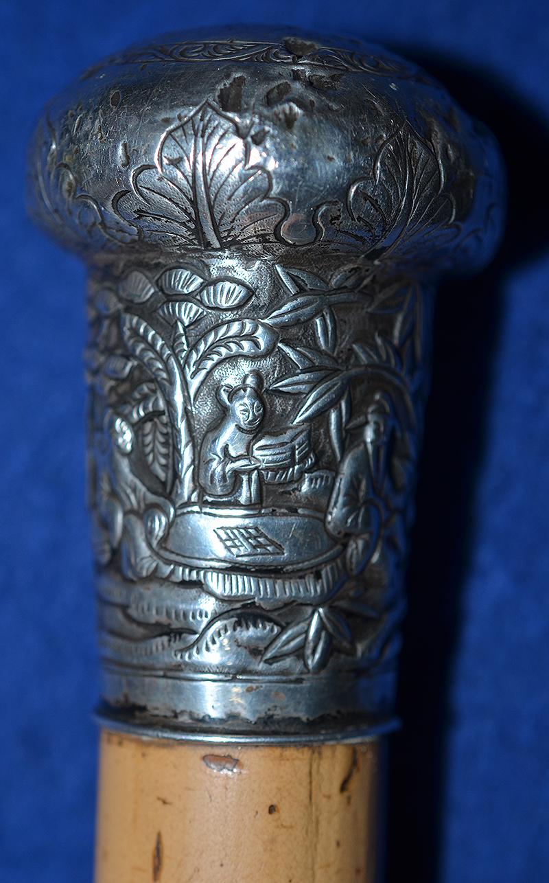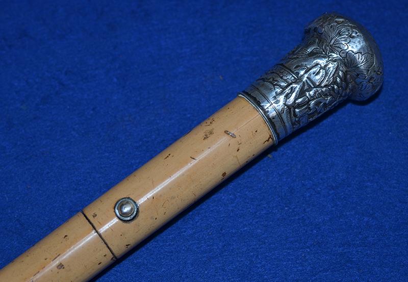 Produced in the European style and dating to about 1900. Very nice malacca wooden cane with silver pommel featuring chines oriental designs, it is not silver marked but it is almost certainly silver. Pressing a button on the upper part of the wooden cane releases the steel blade which is long and very impressive. A high quality sword stick probably carried by a wealthy merchant. Exc++