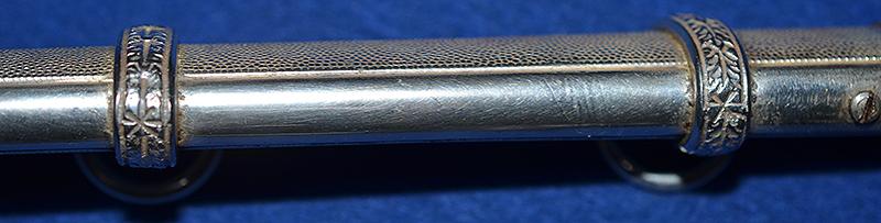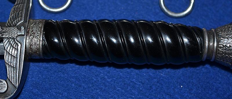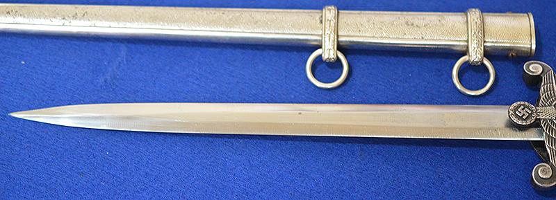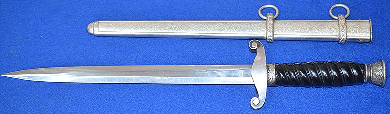 Identical to an army dagger but with a black grip and this is a text book example by Klass with unique features only seen on examples by this maker. Silver plated crossguard and pommel of the Klass type, the black celluloid grip is the desirable extra long type only seen on black grips by this maker. The blade is in mint condition and it is stamped with the makers details, ROBT KLASS SOLINGEN and featuring there kissing Krane's trade mark. The matching silver scabbard is also in fine condition and the scabbard bands have the unique Klass marks to each. A really nice example and a very difficult model to find especially by Klass which is the maker most advanced collectors wish to own. Near mint.