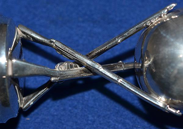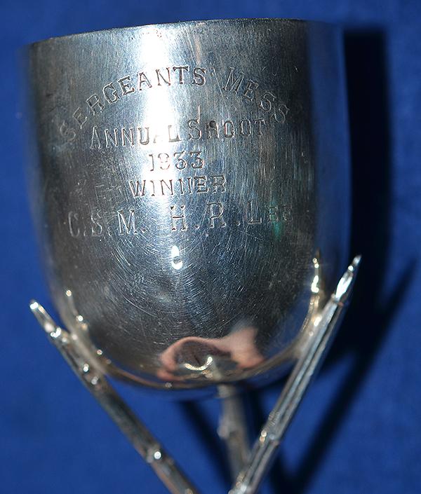 A very attractive silver hallmarked cup which is engraved, SERGEANTS MESS ANNUAL SHOOT 1933 WINNER C.S.M.H.R.LEE. The silver trophy cup sits on three feet which are actually British Enfield military rifles on a silver base. Silver hallmarks for Birmingham 1929 with makers initials. Height 4 inches or 10cm. Exc++