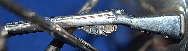 SILVER MILITARY TROPHY CUP SITTING ON THREE MILITARY RIFLES.