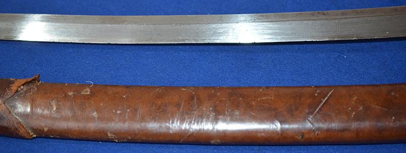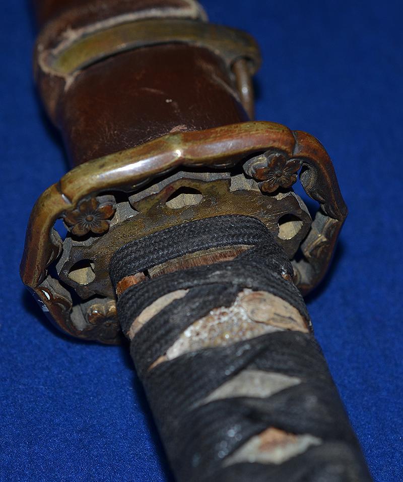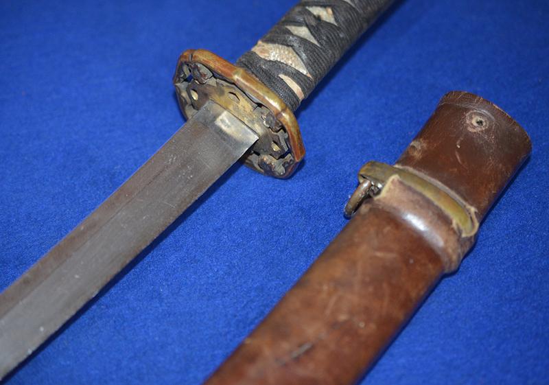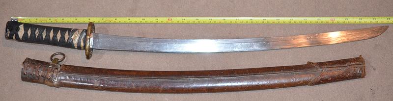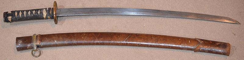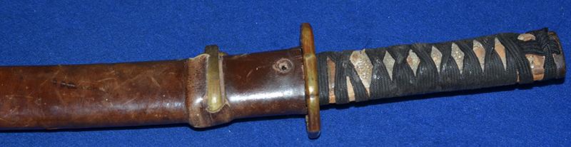 A very nice Japanese officers Katana sword which is shorter than most measuring 31 inches or 78cm long when fitted into its scabbard. Black cloth bound fish skin grip. Ornate brass tsuba. The blade shows some wear with a few tiny nicks to the cutting edge but could be cleaned / restored if required. Complete with scabbard with desirable leather covering. Not mint but priced accordingly and certainly still very collectable and good value. Exc+