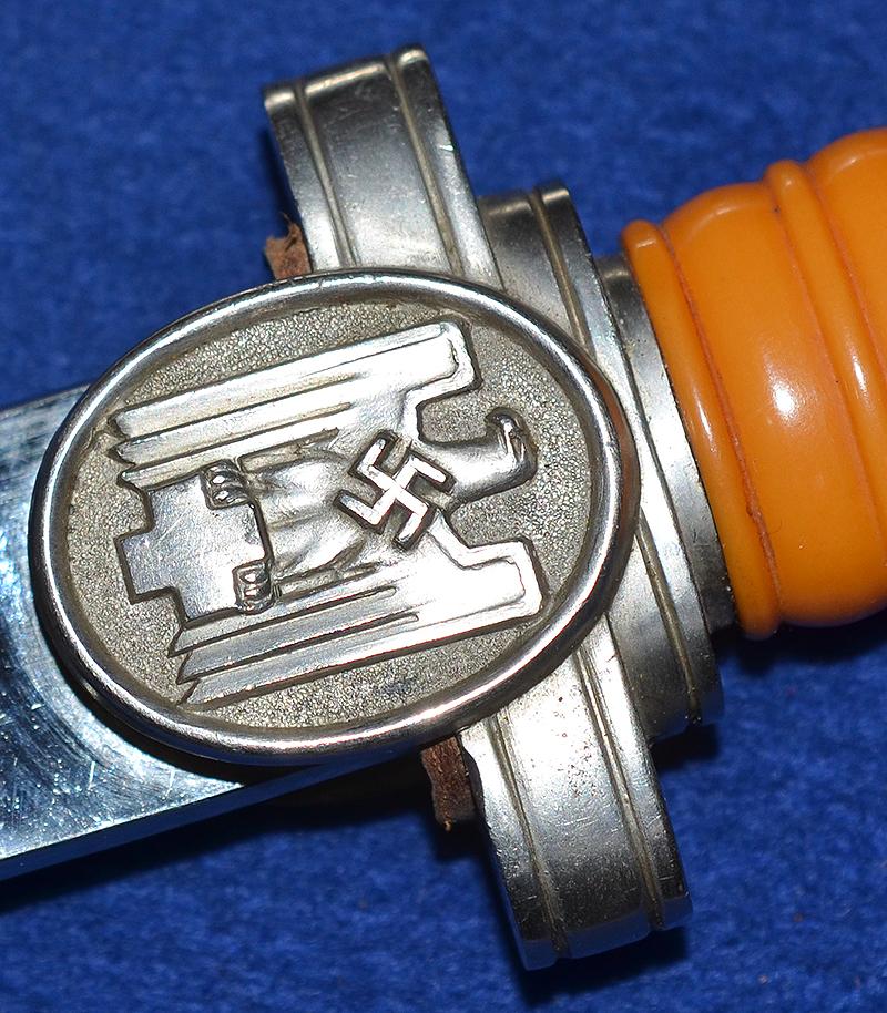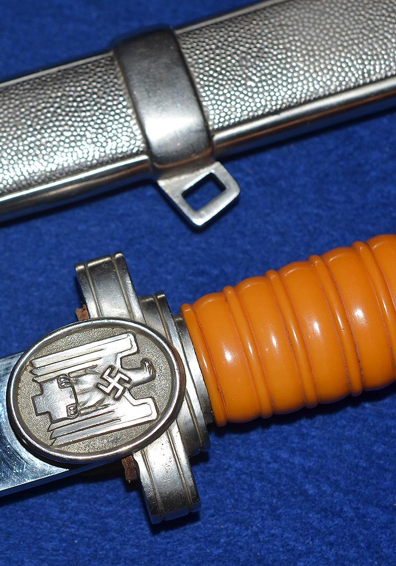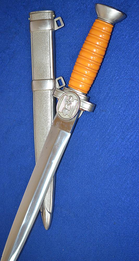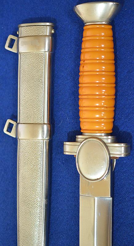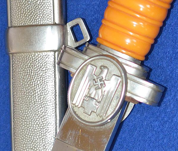 All silver finish remaining to hilt fittings and with fine detail to the red cross eagle and swastika design. Mint orange grip. The blade is in mint condition and it is very impressive. The matching scabbard is also in mint condition. Difficult to improve on this one. Just about mint condition.