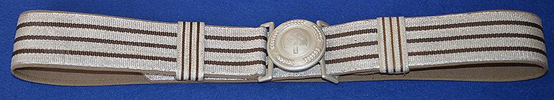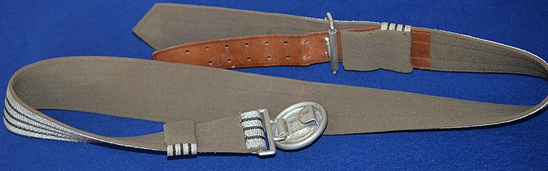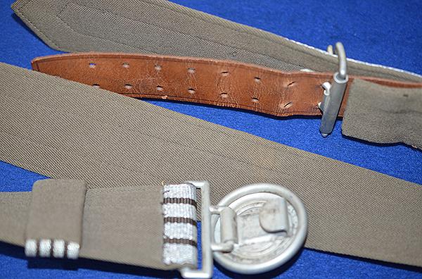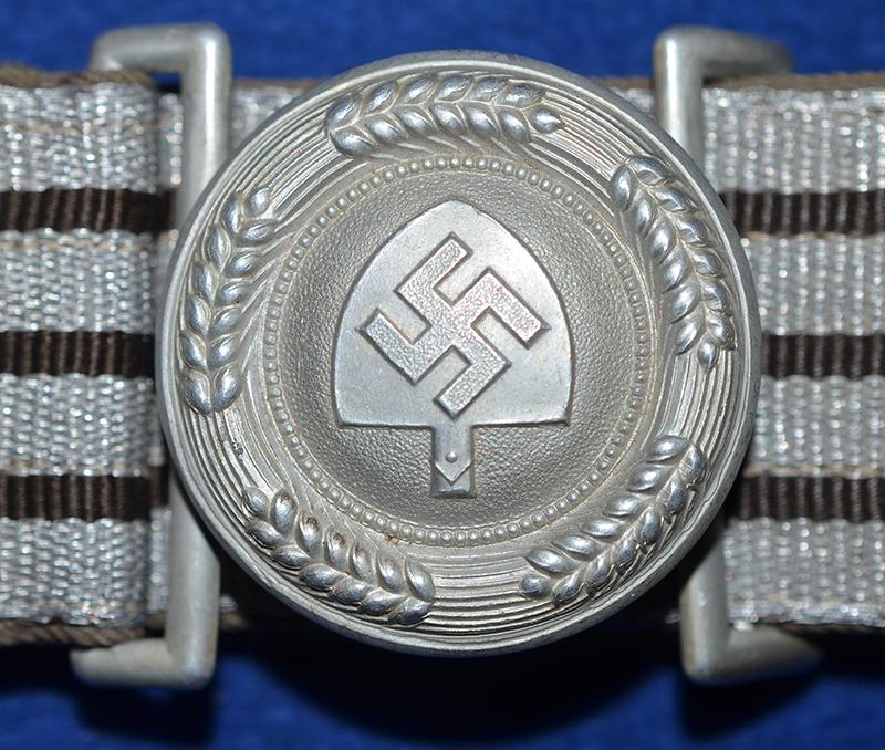 Silver brocade belt with triple brown stripes with brown backing material on the reverse side, complete with brocade belt runners. Circular silver aluminium buckle with the RAD spade with swastika design. The reverse side of the buckle is marked, DRGM 38 and with a large A for the maker Assmann. Mint.