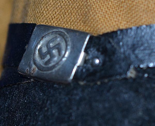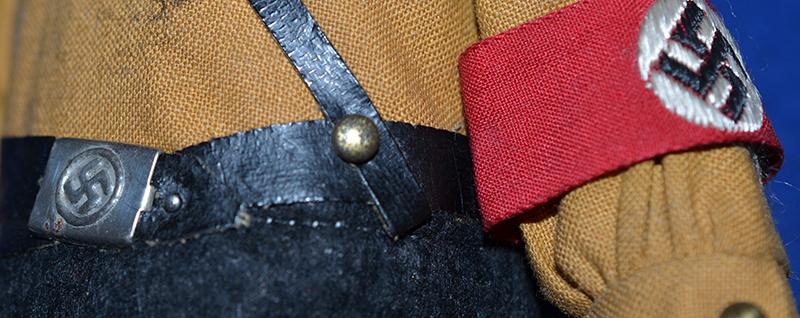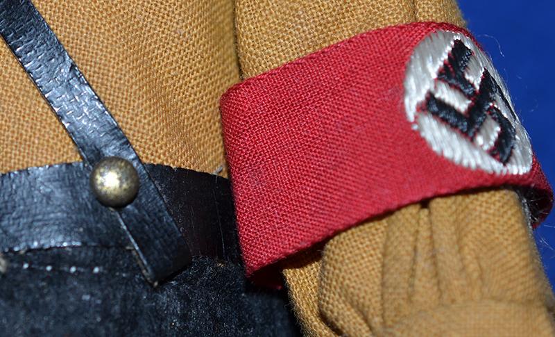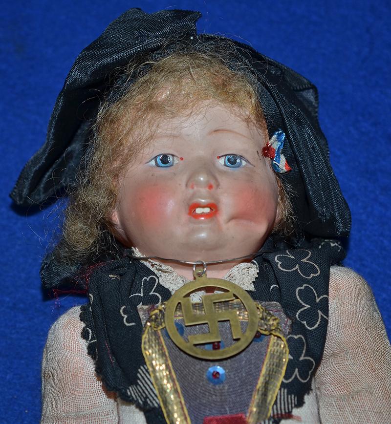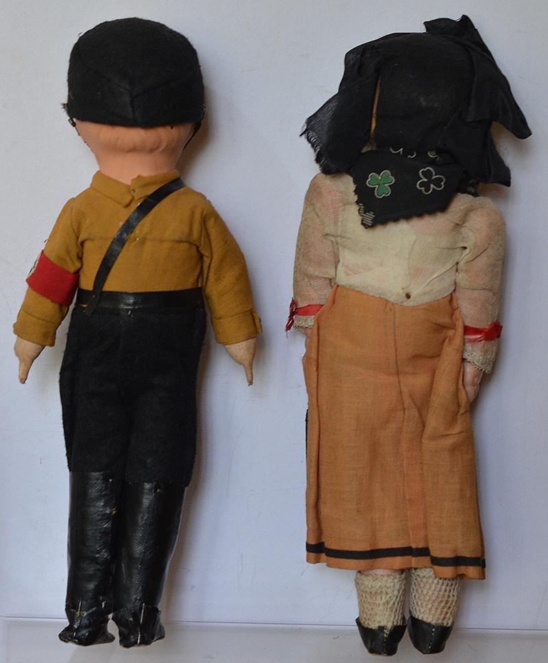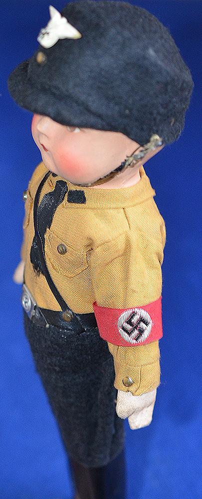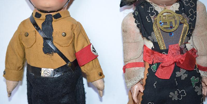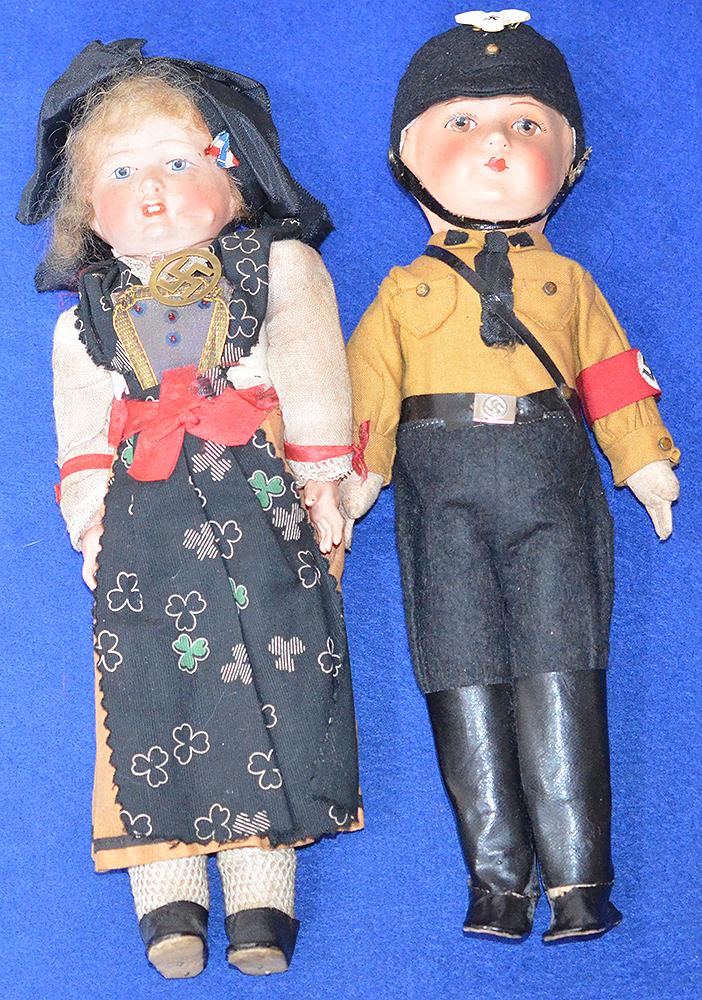 A superb pair of Third Reich dolls standing at 12 inches or 30cm each. The male doll is dress as an SS man wearing black kepi with small silver eagle and swastika badge, brown shirt with black collar patches and swastika arm band complete with black belt with swastika buckle and cross strap with black neck tie. Black breeches complete with black jack boots. The female doll is wearing traditional Bavarian costume with black cloth hat, brown dress and ornate apron with red silk belt, she is wearing a metal swastika pendant suspended from her neck. The female doll has a slight bruise to the right side of her face, (she must have been a real street fighter in the battle against the reds in the kampzeitze), the male SS doll is perfect. Exc++
