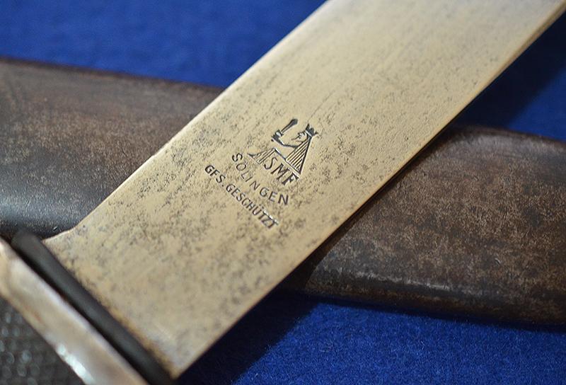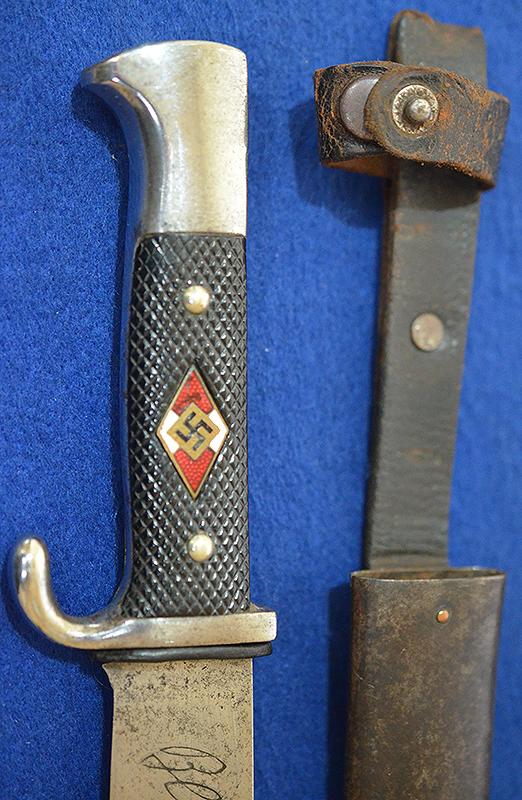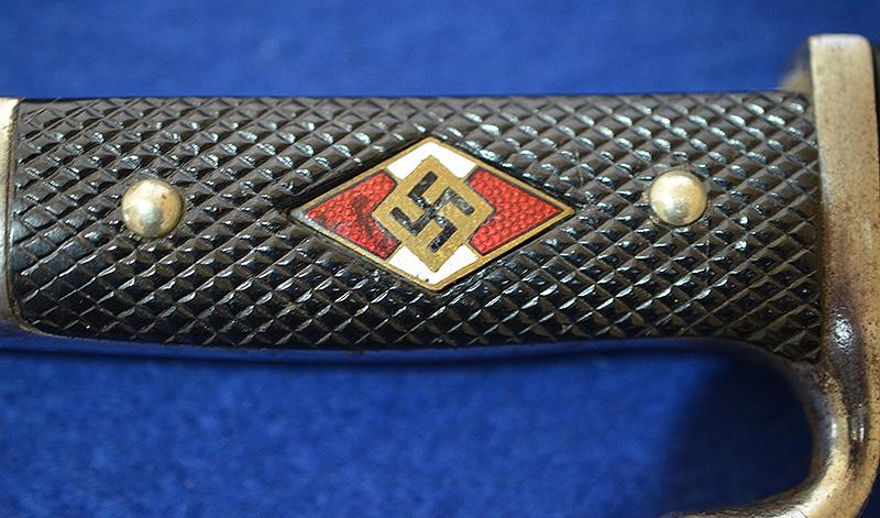 Silver hilt is in perfect condition with no damage at all. The black celluloid grip plates are in perfect condition and it is complete with HJ enamel diamond badge just showing slight wear but no damage. The early style blade features the HJ motto to the obverse side, the reverse side is maker marked, SMF Solingen GFS.GESCHUTZT, SMF is a rare maker to find on HJ knifes, there is some slight age marks to the blade but over all it is still very nice and a lot better than most. Blued anodised scabbard shows some age wear but it is still nice. Complete with black belt loop and grip retaining strap. A very nice example. Exc++