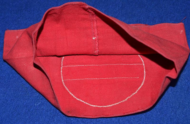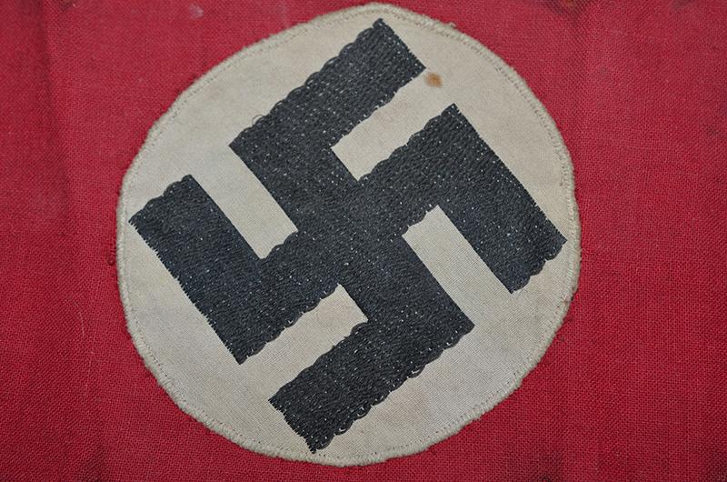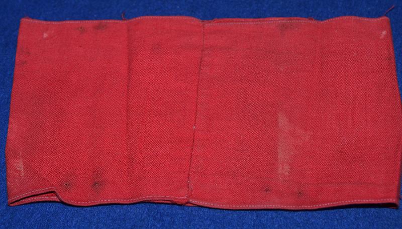 Red cotton arm band with separately applied white circle and black woven swastika. Removed from a tunic, probably worn on a brown shirt. Exc++