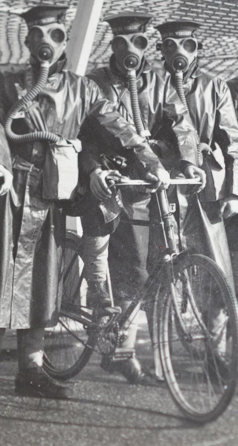 A very unusual post card dating to the 1930's that depicts 10 British navel personnel on bicycles all of which are wearing gas masks, they are also wearing naval caps with the cap tally of HMS ST VINCENT. near mint.
