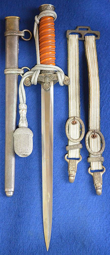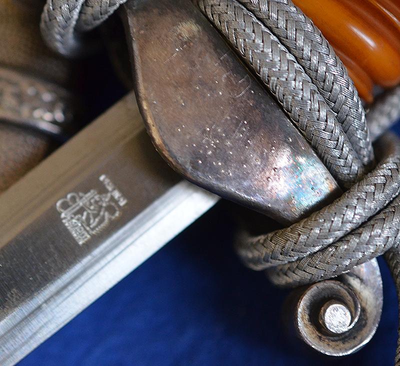 A superb high quality example that has never been cleaned and so has a very attractive black age patina. Mint dark orange grip. Fine detail to the Eickhorn pattern crossguard and pommel. The blade is in mint condition, the reverse side features the Eichhorn Solingen 1935/41 pattern trade mark but this is the scarce small stamped pattern trade mark, a scarce variation which is not seen that often. The matching Eickhorn pattern scabbard is also in mint condition. Complete with a very nice set of deluxe army officers straps and silver knot. A really beautiful example, probably impossible to improve on this one. Mint.
