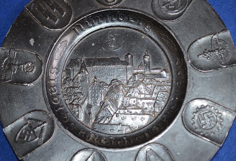 Very attractive factory blackened metal salver with the central design of Nuremberg castle and with the inscription, NURNBERG STADT DER REICHSPARTEITAGE, and the outer edge of the salver displays nine shields bearing the designs of nine organisations of the party and state, STATE EAGLE, SS, SA, NSFK. DAF. FRAUENSCHAFT, HJ. RAD, NSKK. The reverse side features wall hanging loop. These NSDAP Salvers and other similar items were sold at the yearly Nurnberg party rally as commemorative souvenir items. Near mint.