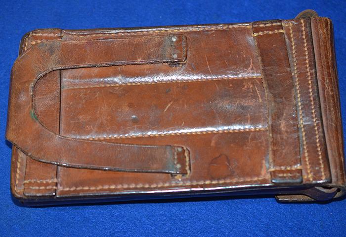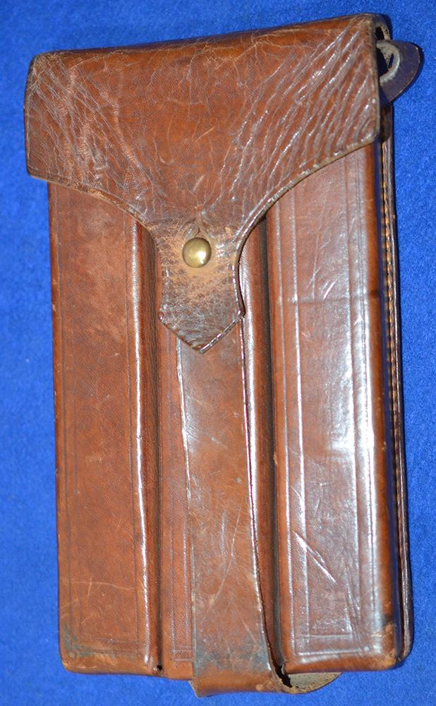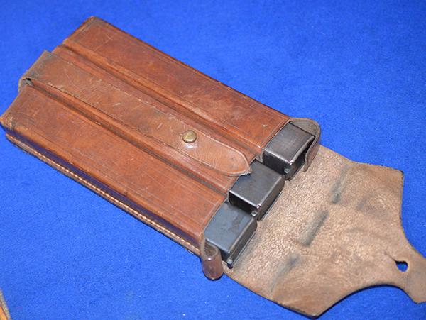 A very nice brown leather pouch for the MP34 submachine gun magazines, complete with three metal gun magazines. The MP34 was often issued to the German security forces and the Police. Exc++