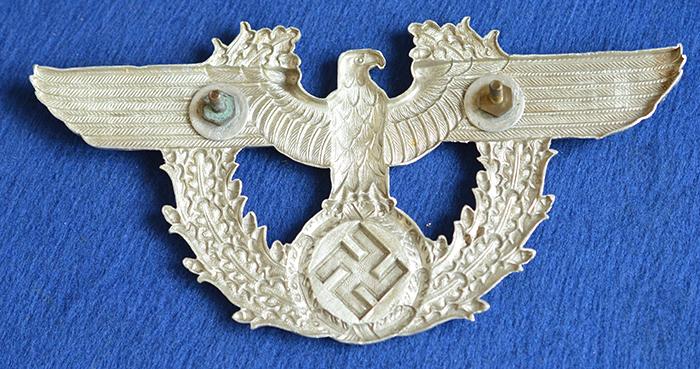 Large silver aluminium Police eagle for the shako helmet with good detail to the eagle and swastika. The reverse side has two fitment posts complete with the original screw fittings. Mint