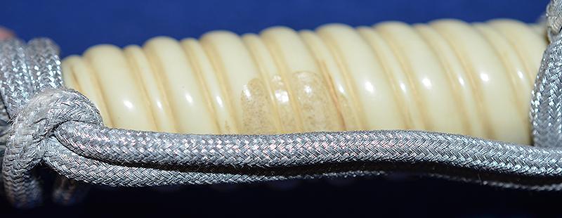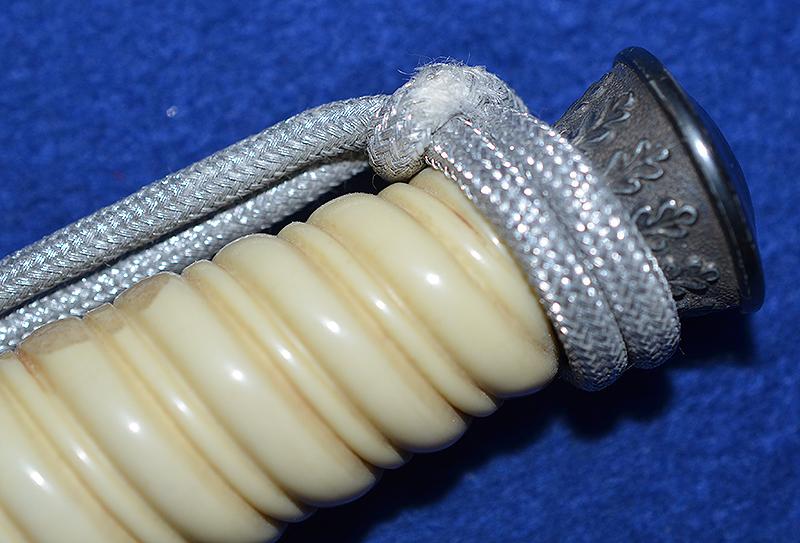 All the fitting have a nice age patina as the dagger has not been cleaned for a very long time. Fine detail to the crossguard eagle and pommel. The white celluloid grip is in fine condition with just slight wear on one side just under the knot cord. The blade is by Holler Solingen and it is in excellent condition just showing light age, this is a nice blade. Matching silver plated scabbard with no dents or damage. Complete with a very nice quality set of straps and silver knot that is tied very tight and looks to have always been in place. Exc++