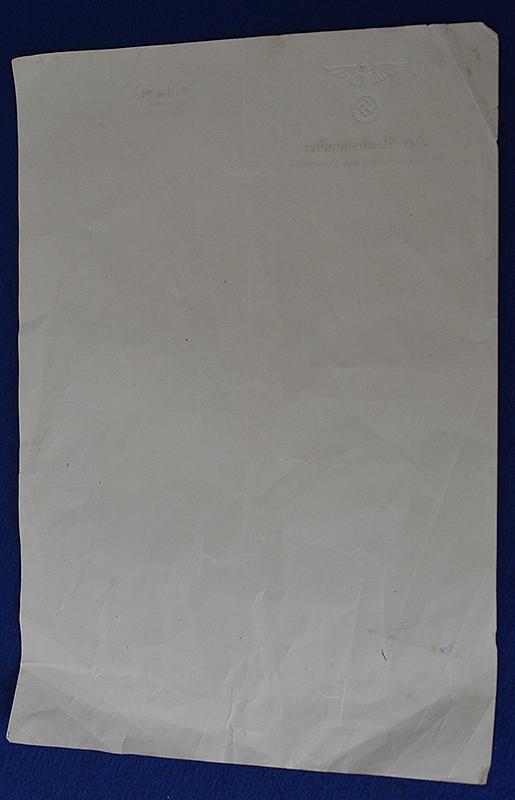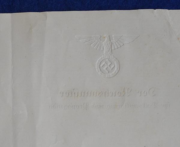 A single sheet of un-used note paper from Dr Goebbes office. White sheet of paper with black printed title and blind embossed state eagle and swastika seal. Der Reichsminister fur Volksauftlarung und Propaganda. Berlin W8 Wilhelmplatz 8-9 Fernsprecher 110014. A very rare letter head to find, it is certainly the first one I have owned to Dr Goebbels as items associated with him are very rare. Exc++