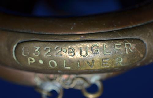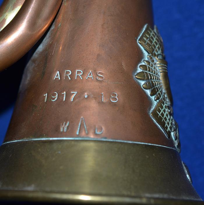 Brass military bugle mounted with three military badges, Kings crown, HLI title and Scottish Highland Light Infantry badge. The bugle is also mounted with small metal seal marked PO and it is also stamped on the side, ARRAS 1917.18 WD with arrow mark. There is also a plaque to the top of the bugle marked, 8322.BUGLER P.OLIVER (probably the original buglers details). Complete with decorative cords. Exc++