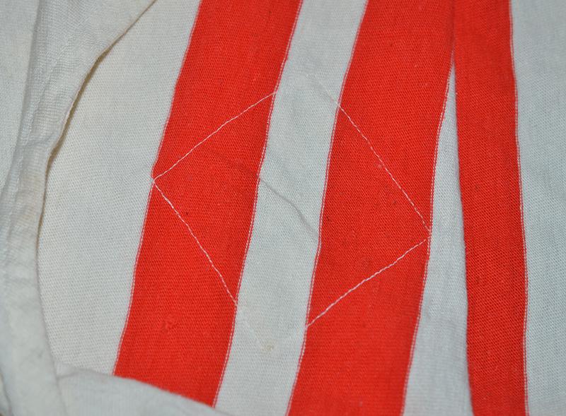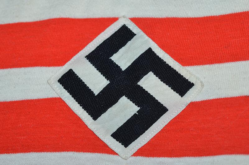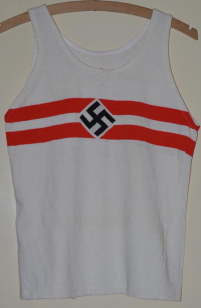 White cotton vest printed with double red strips and with separately applied HJ white diamond with machine embroidered black swastika. Small cloth label to inside marked 5. Near mint.