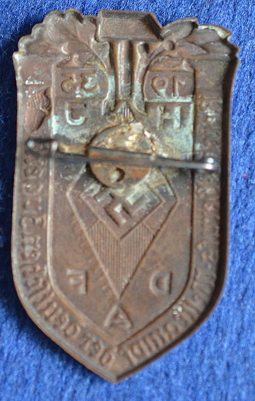 Bronze shield badge, REICHS BERUFS WELLKAMPF DER DEUTSCHEN JUGEND, with central design of HJ swastika diamond and letter HJ DAF. The reverse side is hollow backed and fitted with safety style pin and hook and it is also maker marked. Near mint.