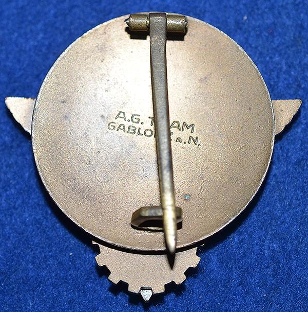 Impressive looking badge, the enamel is in perfect condition. The reverse side is fitted with pin and hook and it is maker marked, A.G.THAM GABLONZ A N. Near mint.