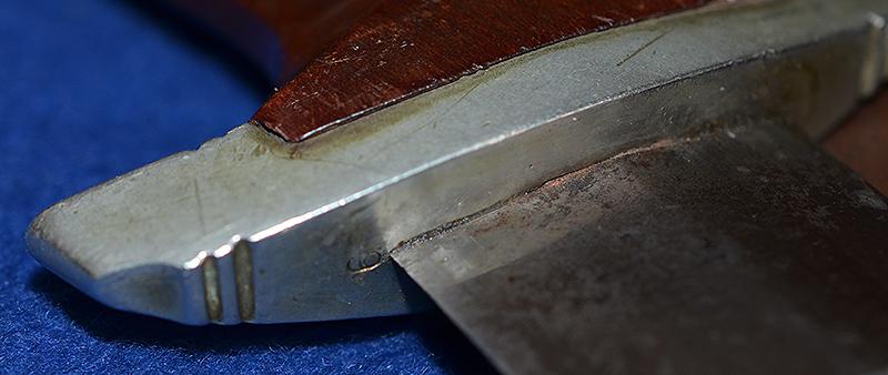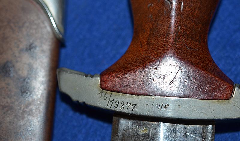 This interesting example features the rare and very desirable and early large oval Eickhorn trade mark. All early nickel silver fittings, the lower crossguard is stamped Wf for the Westfalen SA group and it is also engraved, 16/13877 which is probably for SA Regiment 16 and the owners Ausweise number, the bottom of the crossguard is stamped 9 which is the factory workers bench number which is often seen on very early daggers by Eickhorn. The brown wooden grip is in fine condition and it is complete with SA insignia and silver eagle, it appears that the eagle might have taken a slight bump in its wearing life as the left wing is slightly tilted downwards but this might be just how it was mounted as the grip has a hand finished look to it which often early daggers do. The blade does show some age spotting and one tiny nick to the cutting edge but no pitting just natural age, the obverse side features the SA motto and the reverse side the rare and very early production large Eickhorn oval trade mark, if it was originally a Rohm blade there is no trace of the inscription now. Brown anodised scabbard with matching nickel silver fittings, there is a slight dent to the very bottom of the ball but it is not really noticeable. Complete with SA brown leather hanger and belt loop. Not a mint dagger but a very interesting example being unit marked and very early production. Exc++