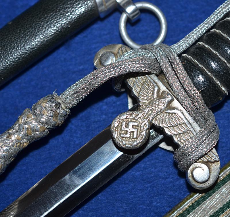 All fittings are the more desirable aluminium type. Fine detail to to pommel and Customs crossguard eagle with up turned wing tips in the customs style. The green leather grip in in mint condition. Near mint blade by Horster Solingen. The scabbard shell is fitted with dark green leather and it is in perfect condition, it is complete with three matching aluminium fittings. Complete with silver knot and a very nice set of Land Customs straps. Most Customs daggers are constructed in a combination of aluminium and steel plated fitting, dagger produced in full aluminium are considerably harder to find and much more desirable and this example is probably the best you will ever find as it is in close to mint condition. Near mint.